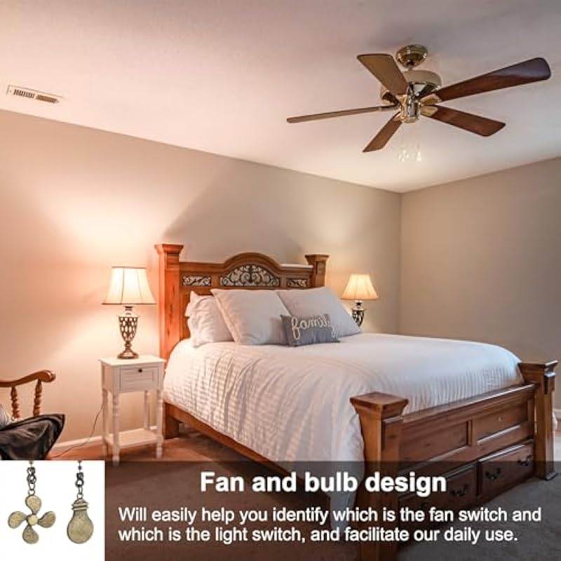 - Advantage: 1. Fan and bulb design, fan pull chain will easily help you identify which is the fan switch and which is the light switch, and facilitate our daily use. 2. The ceiling fan pull chain is made of quality alloy, it is heavy enough and will not sway in the wind, is sturdy and resistant to falling, rust-resistant, not easy to be hurt and fade, and has a long service life. 3. The length is suitable and can be reached by raising your hand, making it easy for you to switch on and off.