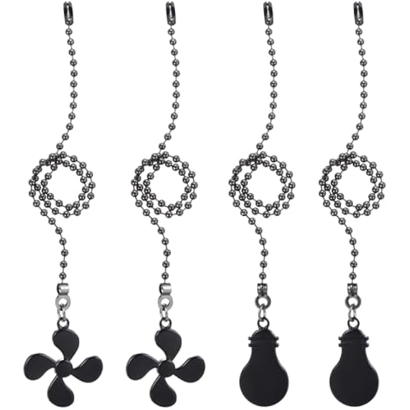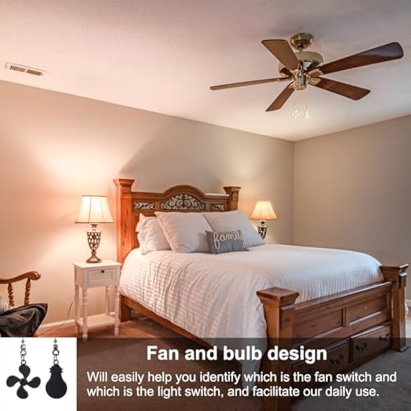 - Advantage: 1. Fan and bulb design, fan pull chain will easily help you identify which is the fan switch and which is the light switch, and facilitate our daily use. 2. The ceiling fan pull chain is made of quality alloy, it is heavy enough and will not sway in the wind, is sturdy and resistant to falling, rust-resistant, not easy to be hurt and fade, and has a long service life. 3. The length is suitable and can be reached by raising your hand, making it easy for you to switch on and off.