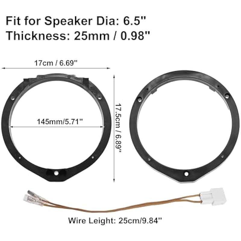 - Fit for Speaker Dia: 6.5″, Thickness: 25mm / 0.98″, Inner Diameter: 133mm/5.24″, Size: 19×18.5×2.5cm / 7.48″x7.28″x0.98″(L*W*T), Wire Lenght: 26cm/10.24″, Number of Pins: 2