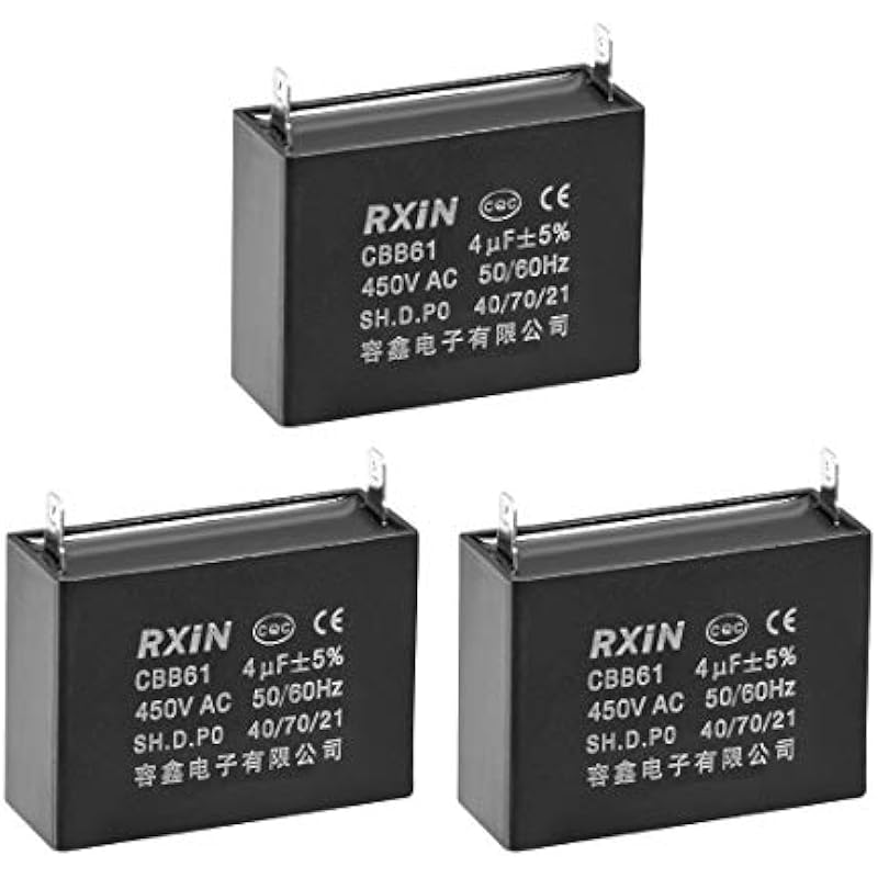 uxcell Ceiling Fan Capacitor CBB61 4uF 450V AC Single Insert Metalized Polypropylene Film Capacitors 47x18x34mm for Water Pump Motor Generator, Pack of 3