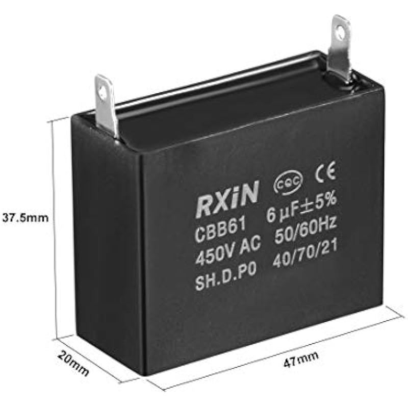 - [Specification] -Rated Capacity: 6uF; Tolerance: ±5%; Rated Voltage: 450V AC; Cover Size: 47x20x37.5mm / 1.9×0.8×1.5inch; Rated Frequency: 50/60Hz; Temperature Range: 40/70/21