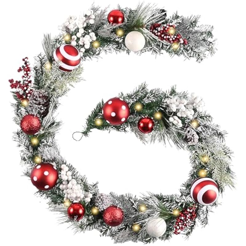 Valery Madelyn 9 Feet Pre-Lit Christmas Garland with Lights for Mantle, Lighted Outdoor Xmas Garland with Red White Balls for Home Stairs Fireplace Table Centerpiece Indoor Holiday Party Decor