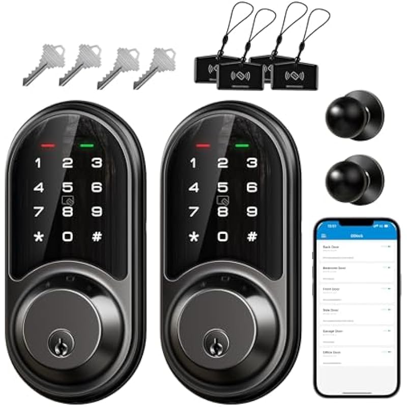 - Keyless Entry Door Lock: The smart lock has a 5 in 1 access method: App + Fobs + Password + Key + Thumb turn