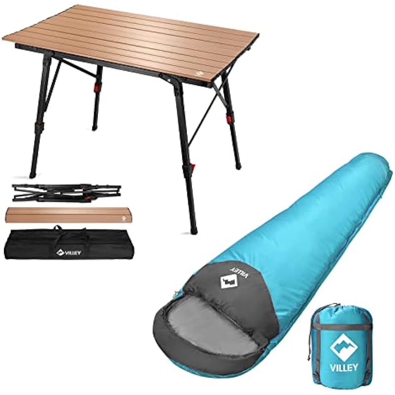VILLEY Portable Camping Table with Adjustable Legs and Mummy Sleeping Bag