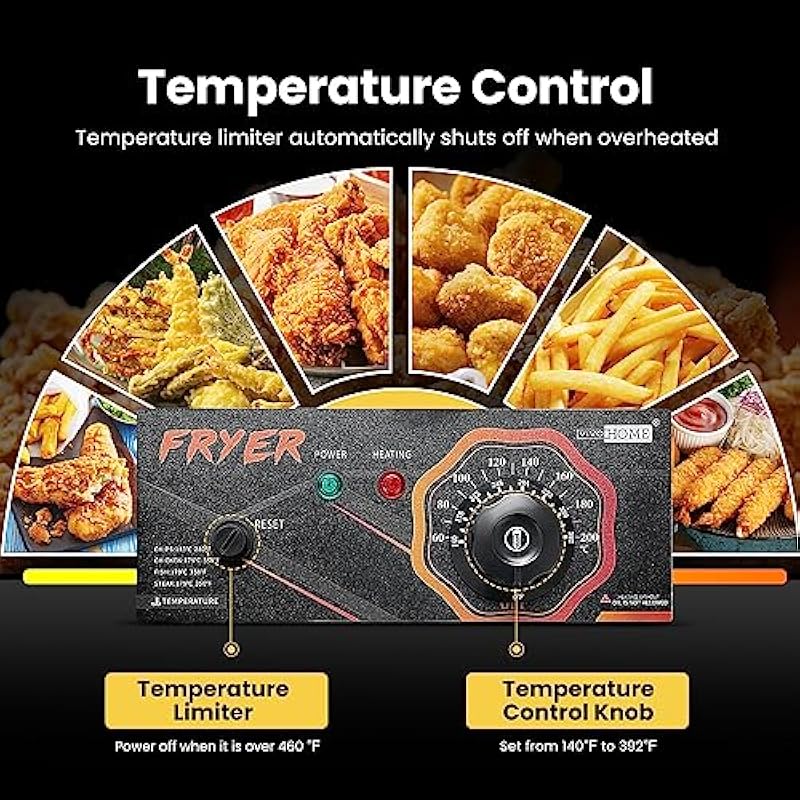 - CONVENIENT AND SAFE – The well-matched lid can prevent hot oil from splashing out and won’t release heavy smoke in the air; The handle of the frying basket can isolate the high temperature during use; The power light and heating indicator light can easily determine if the machine is in use and avoid forgetting to power off after use; A temperature limiter is equipped that automatically shuts down the machine if the temperature rises above 460℉ (240℃), ensuring maximum safety