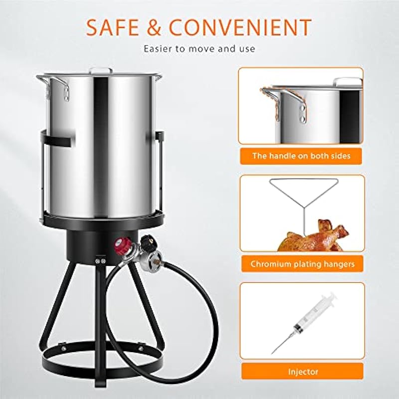 - GREAT OUTPUT – The powerful burner can output max.54,000 total BTU heat, which heats quickly, outputs steady and consistent gas flow, and can maintain temperature; This cast iron burner is equipped with a 10 PSI pressure regulator so you can adjust the flow by controlling it; This 30 qt pot is suitable for frying about 20 pounds of turkey
