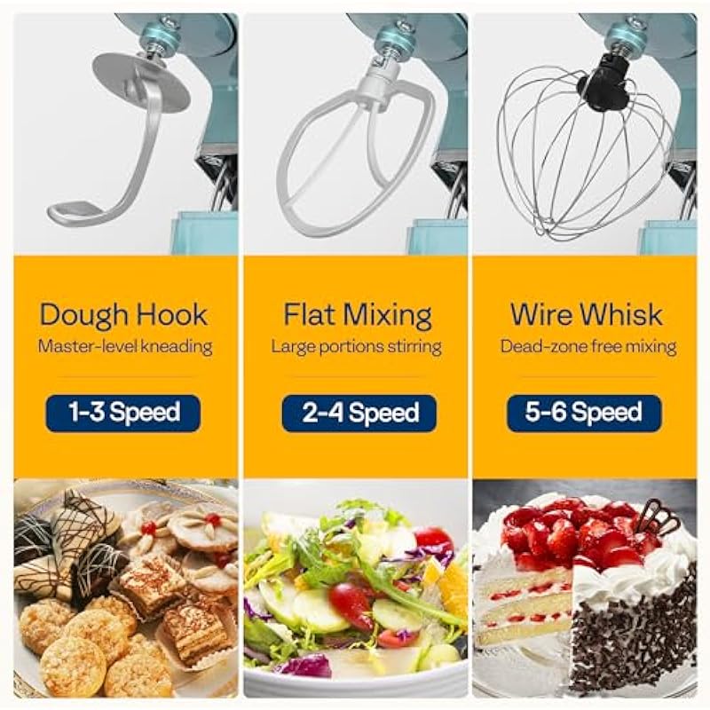 - POWERFUL MOTOR: Equipped with a high-performance 380-watt motor, this stand mixer ensures effortless and consistent whipping, beating, kneading, and thorough mixing; The all-metal gears provide stability and quiet operation (noise level ≤ 76dB); The planetary mixing design moves the beaters around the bowl for even and thorough mixing
