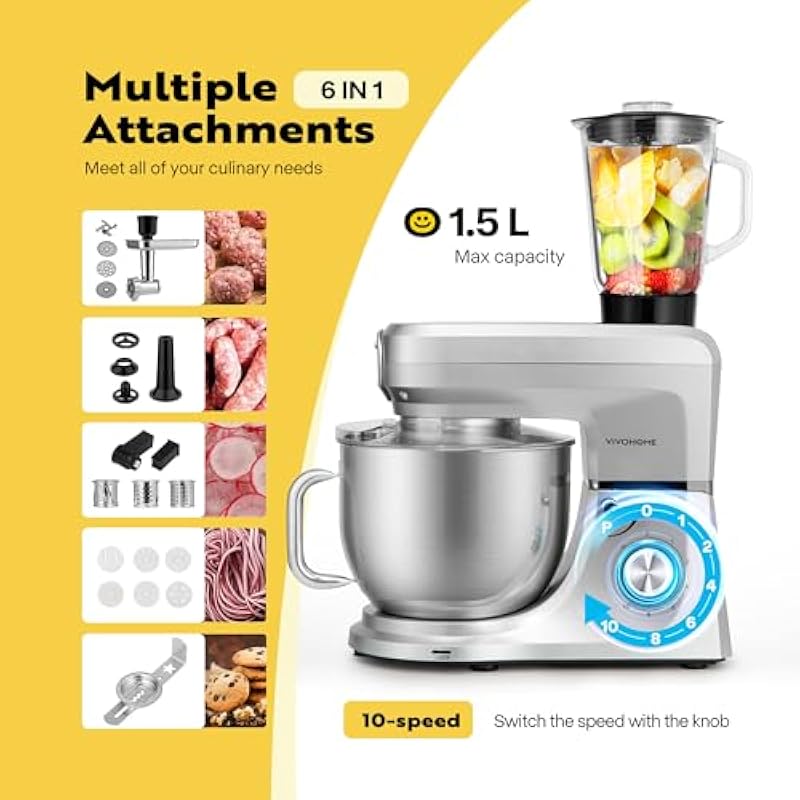 - MULTIPLE ATTACHMENTS – The VIVOHOME stand mixer comes with attachments of a dough hook, whisk, beater, juice blender, meat grinder, pasta maker, and shredder; These attachments provide a wide range of recipe options; Mixer attachments allow for kneading flour, mixing butter, and whipping creams; The juice blender aids in making drinks, while the meat grinder provides freshly ground meat when required; The pasta maker and slicer attachments offer even more possibilities