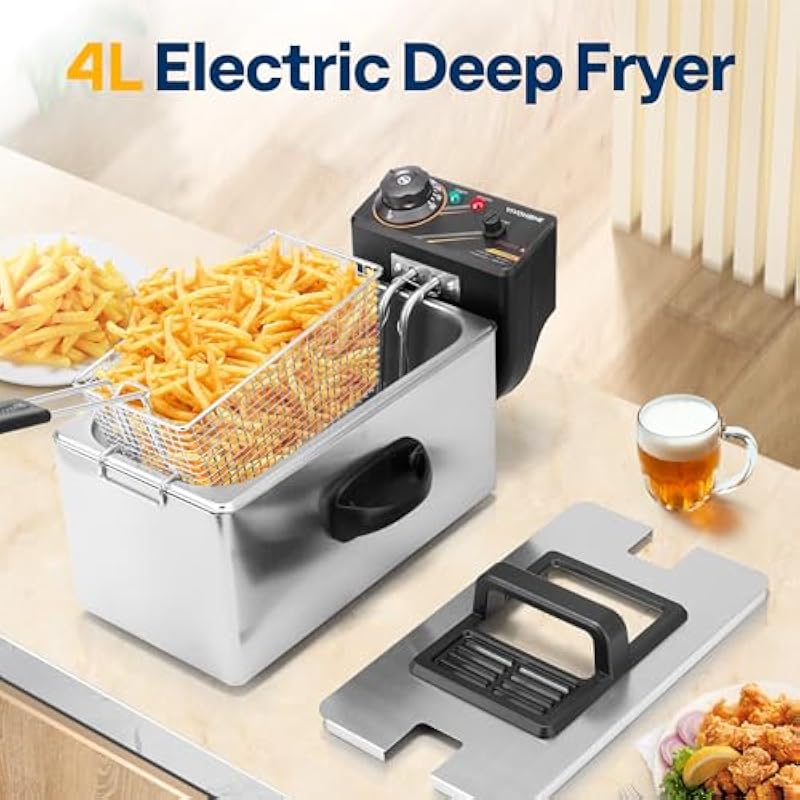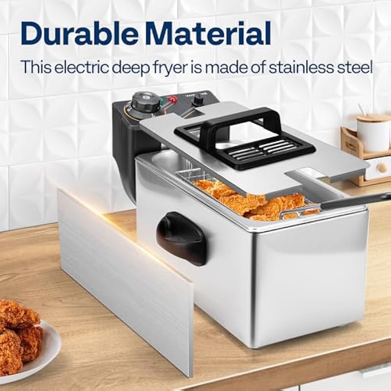 - STURDY AND DURABLE: This electric deep fryer is made of stainless steel, making it rust-resistant, easy to clean, and easy to match with your kitchen style; Anti-slip feet at the bottom keep it stable on the countertop, preventing it from sliding during use; The extended power cord allows you to use it farther from outlets without worrying about proximity; It also includes 2 side handles for easy movement and portability