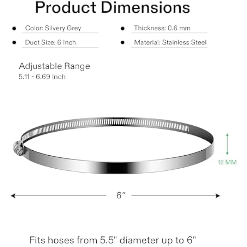 - Detailed Information: Duct Size: 6 inch; Material: Stainless Steel; Package: 2 pcs/set; Adjustable Range: 130-170 mm/5.11-6.69 inch