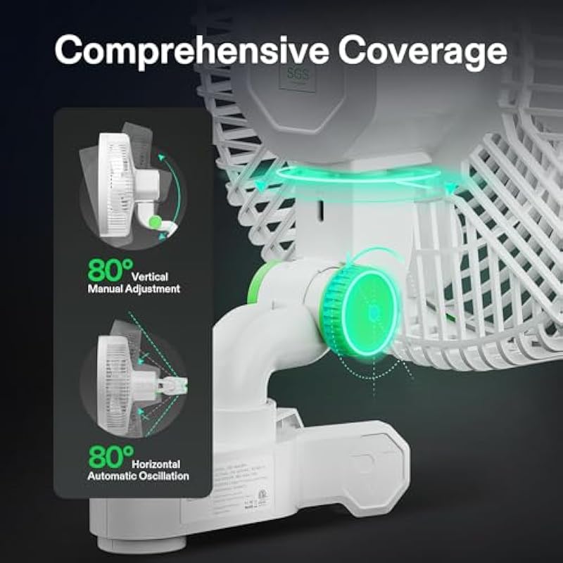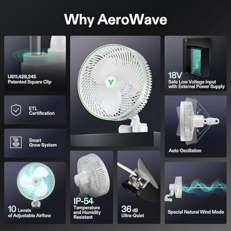 - Quiet Motor-Driven Airflow & Flexible Oscillation:Powered by a durable dual ball bearing EC motor, the Vivosun Aerowave E9 oscillating clip fan delivers strong airflow at a whisper-quiet 36 dB(A), plus 80° horizontal auto-oscillation and 80° manual vertical adjustment for optimal air circulation