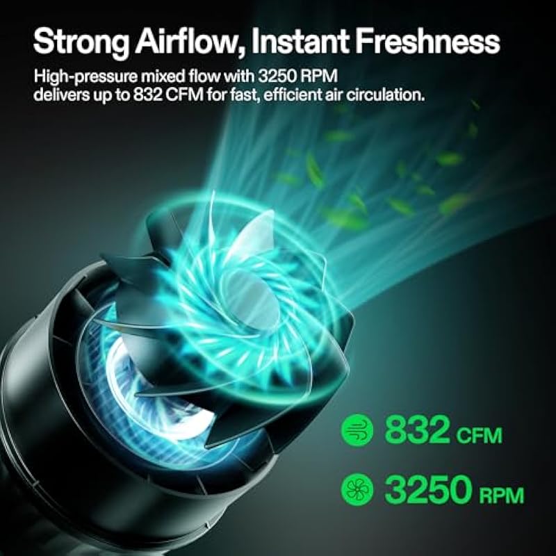 - Strong Airflow for Superior Climate Control: Delivers up to 832 CFM with 3250 RPM speed; Its mixed-flow design offers powerful static pressure, ensuring quick air circulation and effective temperature and humidity control across indoor grow tents of all sizes