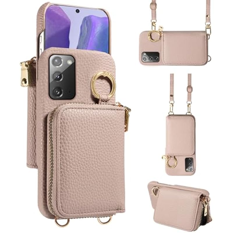 Wallet Case for Samsung Galaxy Note 20 5G with Shoulder Strap Ring Buckle, PU Leather Zipper Flip Organ Purse, Card Holder Stand Phone Cover for Note20 Notes 20s Twenty Not S20 Women Men Khaki