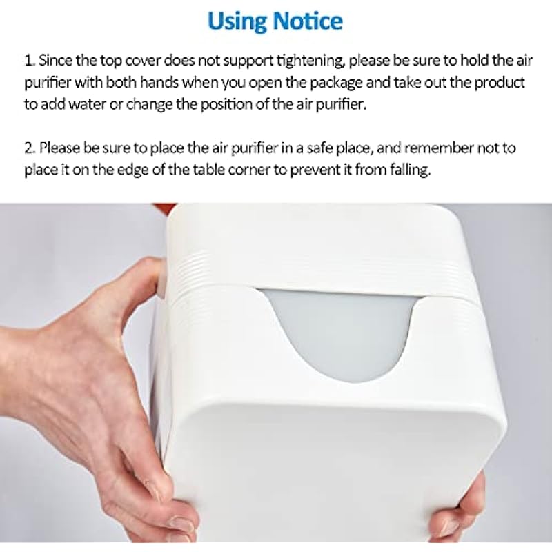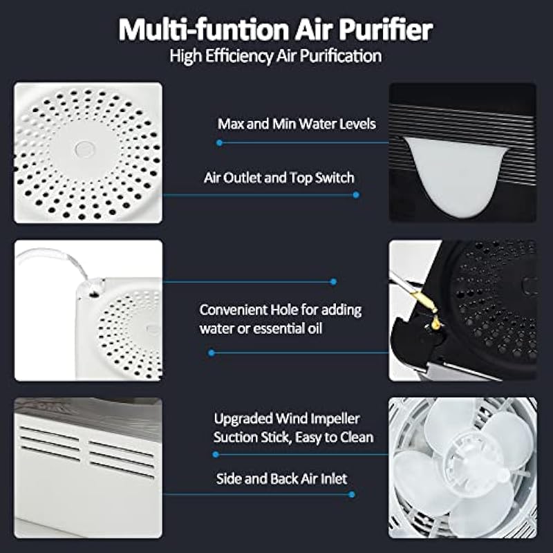 - Material: The top cover and tank housings are made of high-quality ABS. Made with BPA FREE material, can be used with confidence. And you can add a few drops of essential oils into the air purifier, turn stale, dirty air into fresh scented air. Easy to Clean: 1300ml capacity, just need to clean the bottle every day.