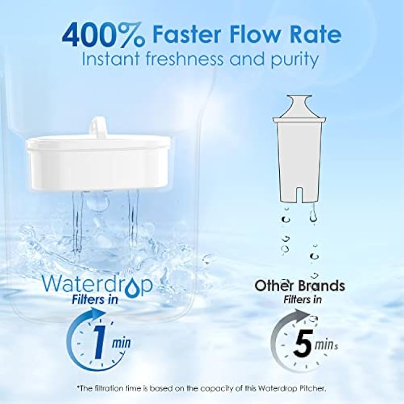 - [NSF certified filtration performance]: This Waterdrop water pitcher has passed NSF42 and 372 certifications, confirming the use of high-quality activated carbon fiber only. The residual chlorine reduction rate is as high as 97.4%.