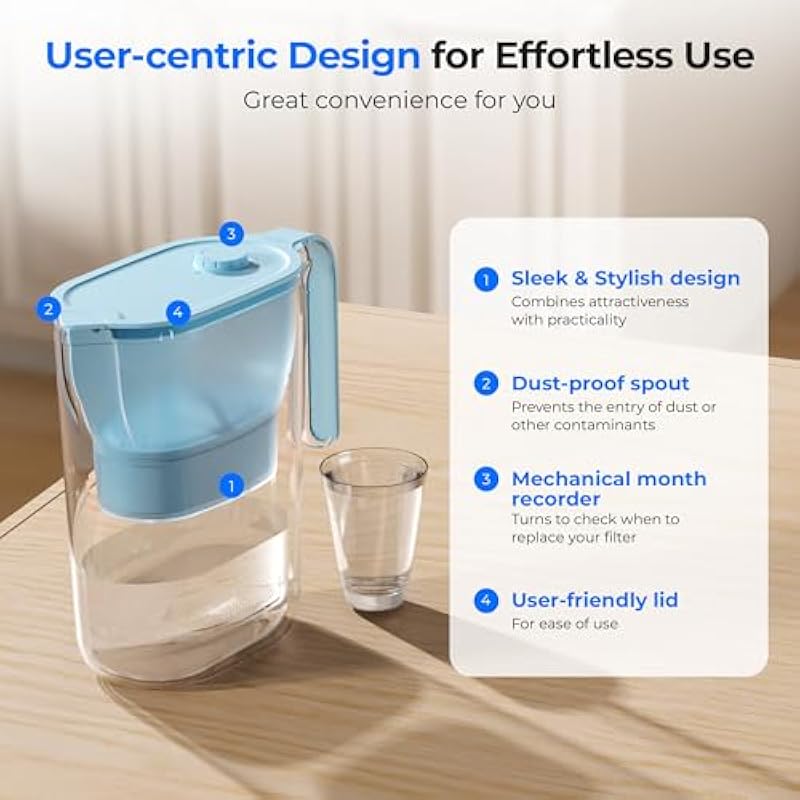 - [Mechanical Life Recorder] This water pitcher with filter for tap water includes a mechanical life recorder to track your filter’s lifespan. This ensures that you can easily monitor the filter’s usage conditions and replace it promptly, eliminating concerns about forgetting to do so.