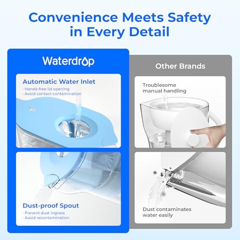 - [Dedicated filtration performance]: Using multi-stage water filter technology, this water filter pitcher can effectively reduce chlorine, PFOA/PFOS, odor, iron, and metal ions, tested by a third lab. The main purpose of the Waterdrop pitcher is not TDS reduction.