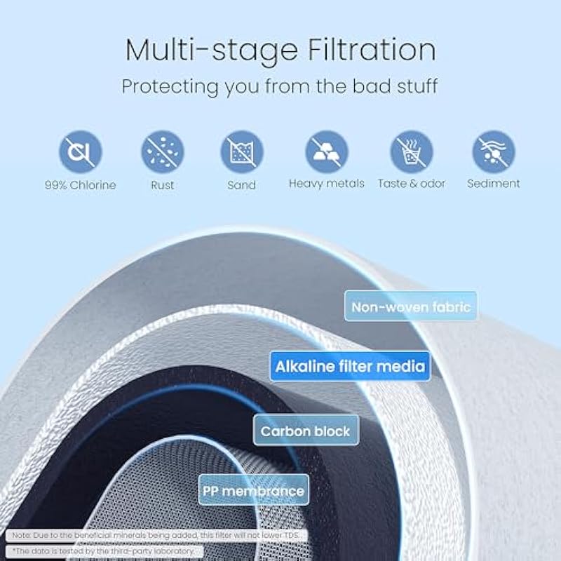 - Advanced Alkaline Multi-Stage Filtration: Our alkaline water filter system utilizes a cutting-edge Multi-stage filtration process, effectively reducing common tap water impurities, including colloid, sediment, up to 99% chlorine, heavy metals, hydrogen sulfide, and fluoride, it ensures your drinking water is safe, tasty, and fresh.(Tested by a third party laboratory)