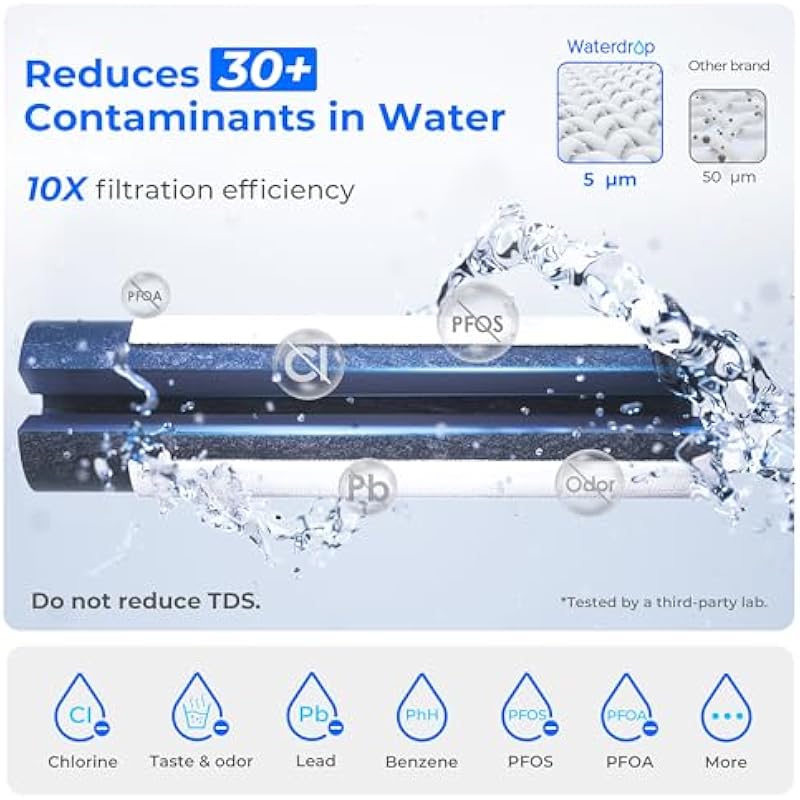 - [Reduces 30+ Contaminants] This Waterdrop filter replacement’s 5 µm premium carbon block filter material offers high accuracy, excellent adsorption, and zero carbon leakage. It effectively reduces impurities, enhancing the purity and taste of your drinking water. To ensure the best taste, please replace the filter promptly after filtering 200 gallons of water or 3 months of use, whichever comes first. 3-pack replacement filters are available for purchase!