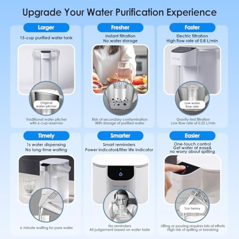 - Get Pure Water in 1 Second: With its electric design and one-key control, this water filter pitcher gives you experience beyond traditional pitchers and dispensers. You no longer have to wait for your water to filter. Simply press a button and get clean water instantly.
