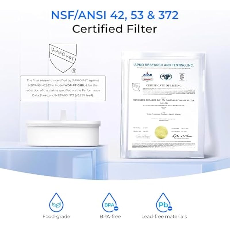- [NSF/ANSI 42, 53 &372 Certified Filter] The filter used in this glass pitcher has been certified against NSF/ANSI 42 for reduction of chlorine and taste and odor, certified against NSF/ANSI 53 for reduction of mercury, and also certified against NSF/ANSI 372 for the lead-free materials (≤0.25% lead).