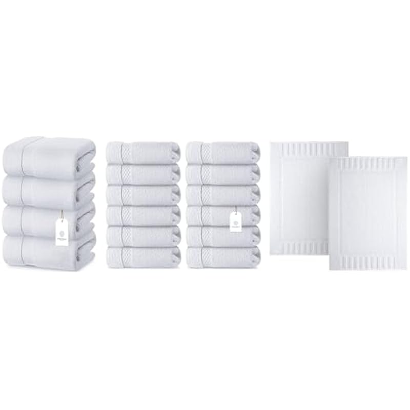 White Classic 4 White Bath Towels 27 x 54 and 12 White Bath Washcloths 13 x 13 and 2 White Bath Mats 22 x 34 | Cotton, Highly Absorbent and Quick Dry for Hotels, Spa and Bathroom