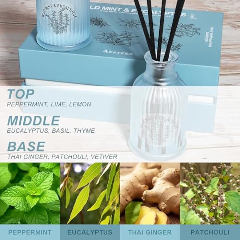 - [ WILD MINT & EUCALYPTUS AROMA ] Top note: peppermint, lime, lemon; Middle note: eucalyptus, basil, thyme; Base note: Thai ginger, patchouli, vetiver.