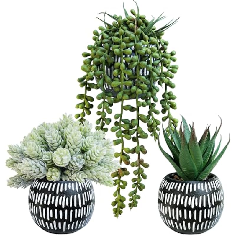 - Quantity: This set includes 3 small faux potted succulent plants: a realistic-looking aloe plant, a hops plant, and a string of pearls plant. Each succulent is housed in a black concrete planter topped with natural pebbles. They look great together as a set of three or can be placed individually around the home.